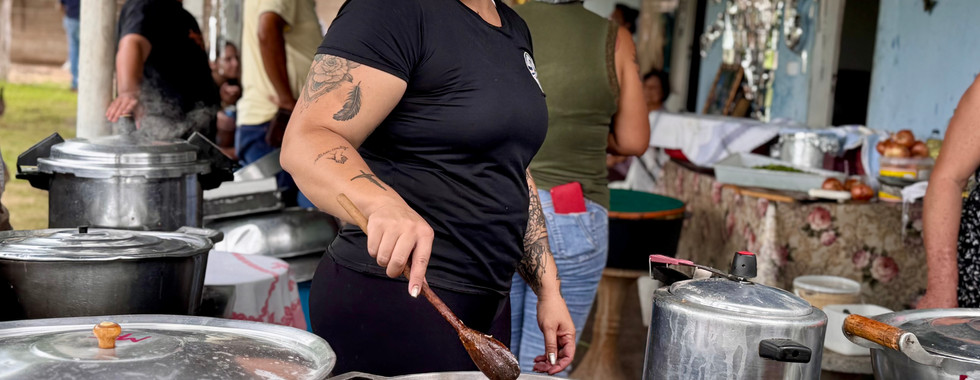 K obědu bude rýže, těstoviny s rajčatovou omáčkou, salát, brambory s vepřovým nebo taky tlusté fazole, což znamená, že se luštěnina připraví na slanině a sádle. Několik mužů popíjí pivo u velikánského podomácku udělaného grilu kombinovaného s udírnou. Na něm se na etapy připravuje devadesát kilo kuřecích stehen marinovaných v hořčici a octu.